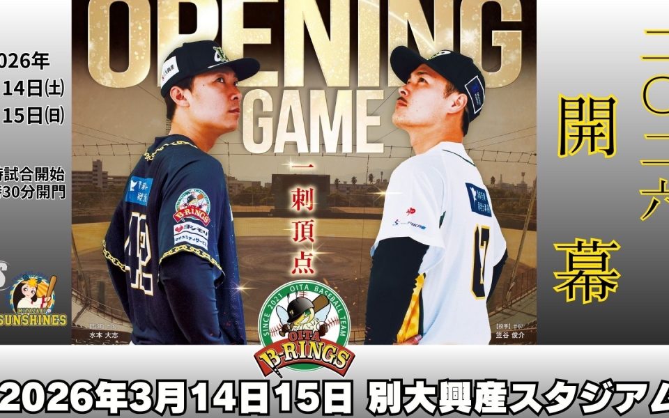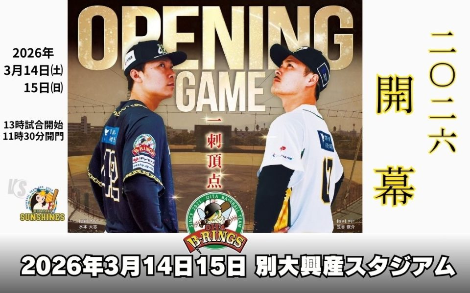 NEWS ニュース すべて お知らせ イベント グッズ メディア 2026.03.052026年シーズン開幕戦のご案内 2026.02.22ファンミーティング開催! 2026.02.15臼杵キャンプイン! 2026.01.23B-リングス2026応援ガール募集!! もっと見る 2026.03.052026年シーズン開幕戦のご案内 2026.02.22ファンミーティング開催! 2026.02.15臼杵キャンプイン! 2026.01.23B-リングス2026応援ガール募集!! もっと見る 2024.07.087 月 27 日・28 日 ホームゲーム親子無料招待について 2024.01.06大分B-リングスファンクラブイベントのお知らせ 2023.05.15【5月21日】※入場料無料※「観戦チャンスデー」📣 2023.04.29【5/3.4 & 5/6.7】NEXT HOME GAME もっと見る 2023.01.04【数量限定】2023ハッピーバック販売のお知らせ 2023.01.03【限定10名】2023年度 オフィシャルファンクラブ『UCHIKAWA PREMIUM MEMBERS』 2023.01.032023年度 オフィシャルファンクラブ『B-FAN』受付開始! 2022.07.07【ファンクラブ限定】七夕リリース もっと見る 2023.04.07YouTubeに公開中! INSIDE B-RINGS 〜大分B-リングス内川聖一選手ホームデビュー戦〜 2022.04.27球団応援歌『進めB-RINGS』CDリリース☆ 2022.04.01ホームゲームをYouTube でLIVE配信行います! 2022.01.132021シーズンの振り返り動画をYouTubeにアップしました! もっと見る